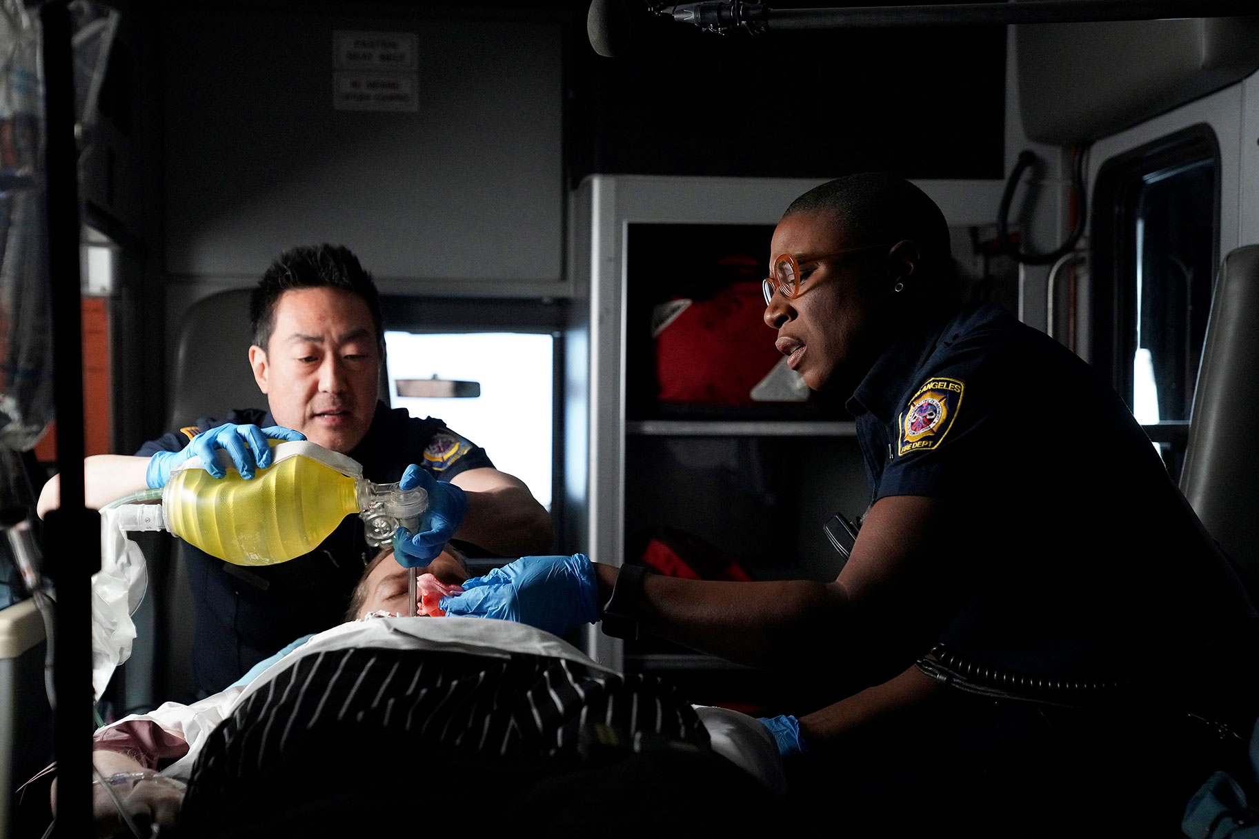 As a result, she has something to prove when they respond to a call where a contestant on a cooking show shook up a nitrous oxide-powered whipped cream canister that then exploded. Shrapnel goes everywhere, including into his chest and face. Hen believes he won’t survive the ambulance ride to the hospital and does a dangerous procedure that Chimney (Kenneth Choi) doesn’t approve of.