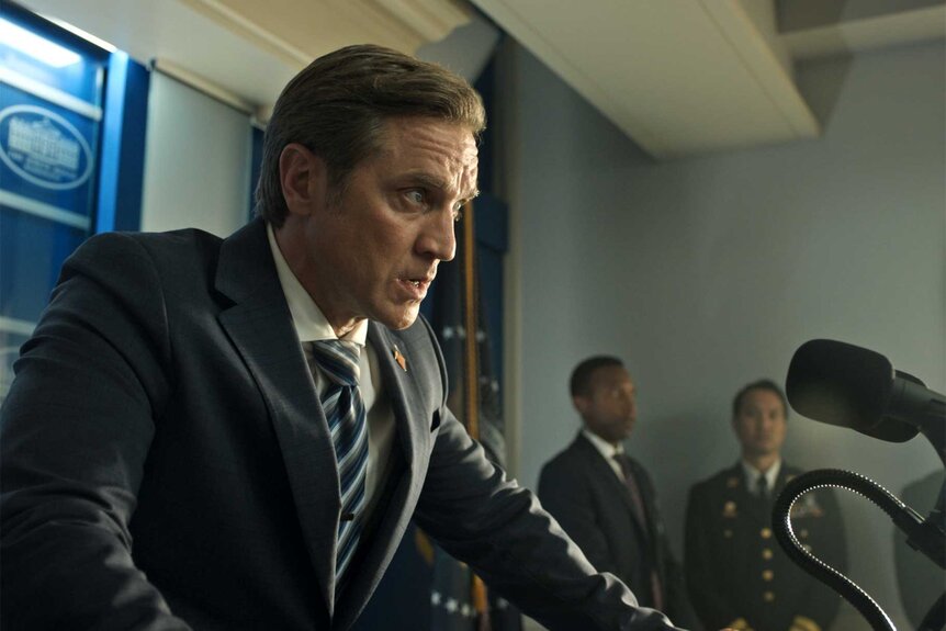 In the below first-look image we see President James Collins (Devon Sawa) looking very perturbed as he addresses the press about the situation.