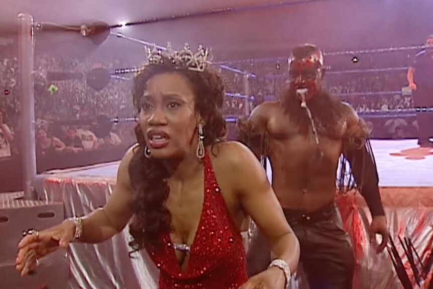 During a March 2006 episode of SmackDown, red smoke filled the arena and Booker T immediately knew that the chase was on. As the former World Champion ran away from the monster, he unfortunately left Sharmell behind. She screamed in terror as The Boogeyman, worms falling out of his mouth and all, appeared behind her. He picked her up and brought her backstage, as Booker T chased the duo to a locked room. Upon finally gaining entry, the entire floor was covered in worms! The couple made their escape, but not before being scarred for life by The Boogeyman.