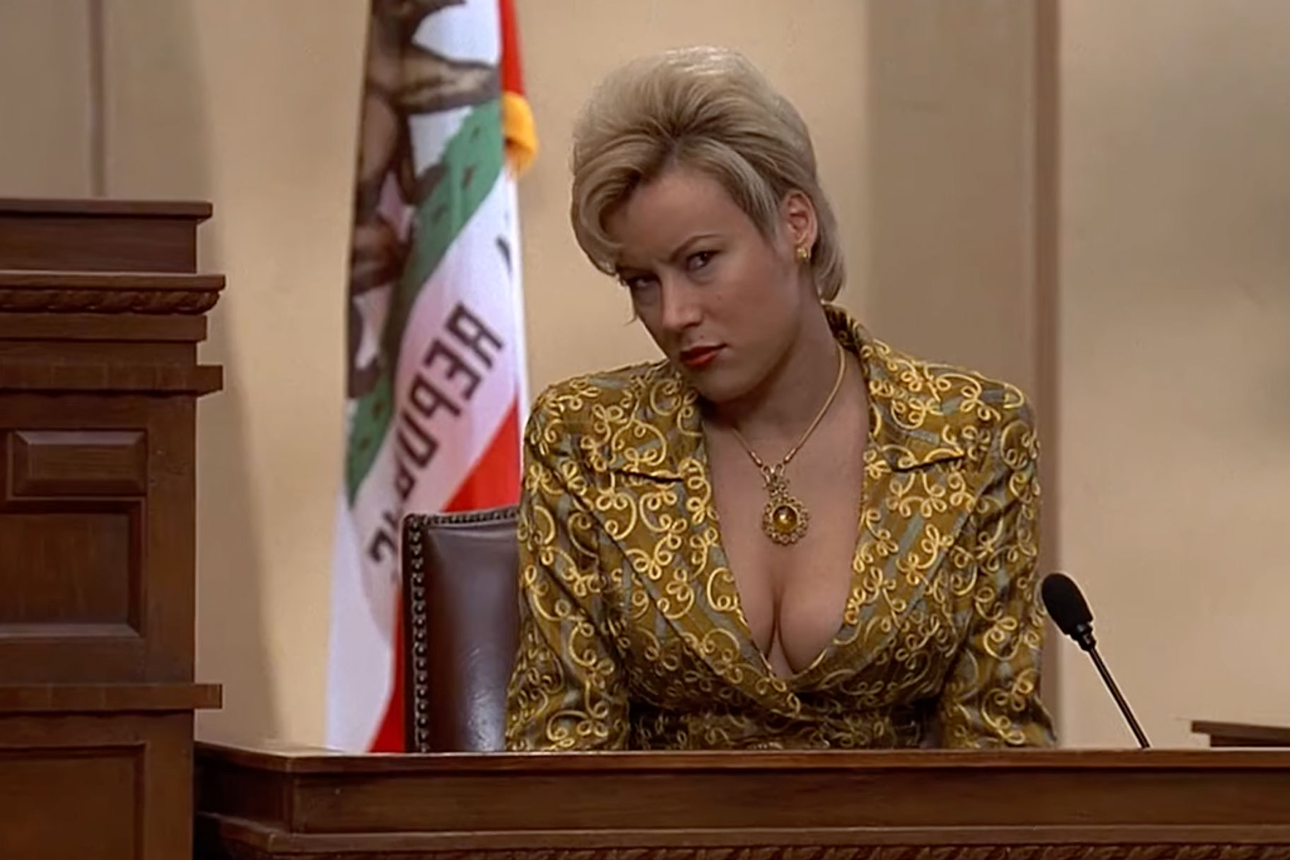 On the living room television, we see an iconic scene from the classic 1997 Jim Carrey vehicle “Liar, Liar,” in which Tilly plays a gold digger named Samantha Cole, who’s in the midst of a contentious divorce. Carrey’s slimy lawyer character Fletcher Reede is her attorney, but the case goes sideways when his son wishes him incapable of lying, resulting in Fletcher being unable to tell even the smallest of fibs. Not the greatest thing for a less-than-savory lawyer.