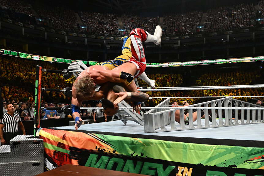 Taking nothing away from Damian Priest's impressive victory, the WWE Universe is still buzzing over the jaw-dropping crash through two ringside tables by Paul and Ricochet near the tail end of the men's Money in the Bank ladder match. Throughout the bout, both Superstars pulled out all the stops. Paul and Ricochet weren't shy about putting their bodies at risk to have a better chance of becoming Mr. Money in the Bank and it seems like these two men can't help but gravitate toward each other during their matches. Nevertheless, time seemed to stand still at one point.