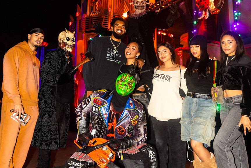 The group posed before the illuminated Universal Plaza, standing in front of a stage equipped with pyrotechnics, skulls, and green and purple lights. With them were a few of the park’s monstrous actors, including a masked punk rocker with a chainsaw, a hatchet-wielding horned skeleton, and an uber-tall three-eyed monster, all of whom captured the very essence of Southern California’s scariest Halloween event.