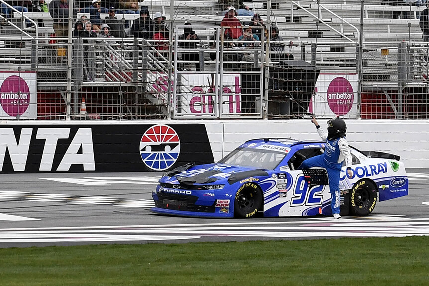 Williams, who pilots the No. 92 Chevrolet Camaro for DGM Racing, was competing in Saturday's RAPTOR King of the Tough 250 at Atlanta Motor Speedway. At Lap 27, he was involved in a wreck, and, after the restart, a piece of debris fell from his vehicle, according to Motorsport.com. At that point, race officials ordered Williams to disembark from the track and head to the garage, but he had another idea. Instead of complying with the request, Williams cruised over and defiantly parked on the checkered start-finish line to cement his protest. Clearly perturbed, he climbed out, removed his helmet and walked over to his pit crew as he waved to the crowd.