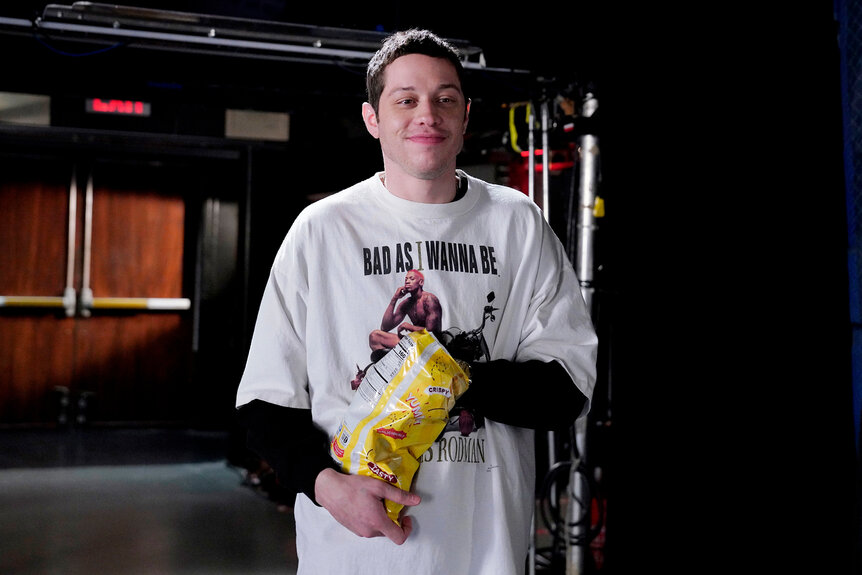 After their fun Suits jab, Yang and Fineman spot Pete Davidson hanging out in the studio eating a bag of chips. He reveals he has been living in the studio while his apartment is under construction. They politely say you need to be a cast member or host to… live in the studio, so he says he’ll go ahead and host.