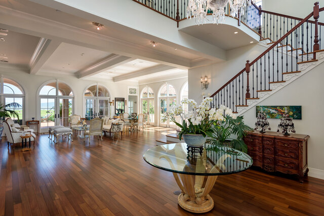 Built in 2008, the property offers massive space both inside and out. The 8,032 sq. ft home includes five full bathrooms, five bedrooms, a garage, and multiple dining areas designed with natural airflow from the mountains in mind. However, its true beauty is found outdoors. In addition to stunning views of the north and south shorelines that can be seen from the in-ground pool, it offers sustainable gardens and wildlife, including peacocks, turkeys, and ducks.