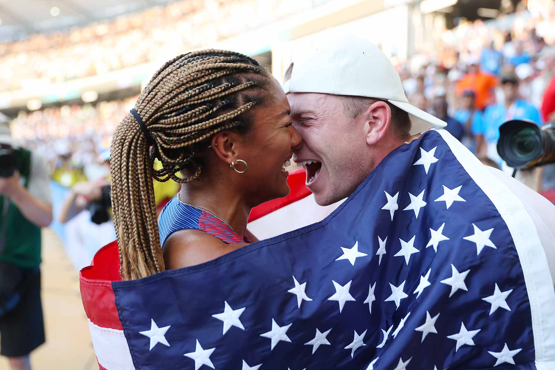 As track phenoms Tara Davis-Woodhall and Hunter Woodhall prepare for the ensuing 2024 Summer Olympics and Paralympics, now seasoned vets, they’re headed to Paris as a unified front, having tied the knot in October 2022. For the Arkansas-based dynamic duo, supporting each other throughout their athletic journeys means everything.