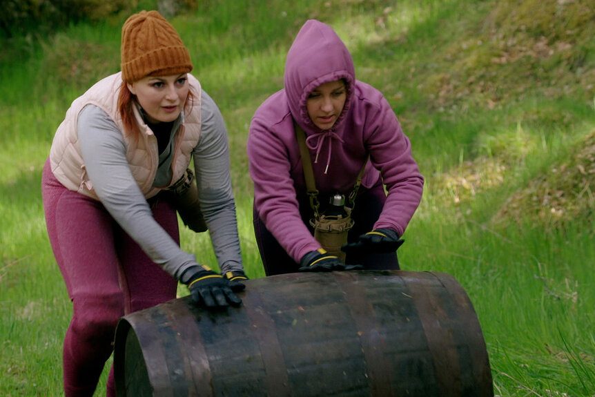There’s nothing more Scottish than having to roll whiskey barrels in the cold. When you add reality stars to that mix, and plenty of ennui about the task, you’ve found a good time. Once again, Kate had the biggest attitude about this mission, shedding her tiny barrels with the finish line in sight. But the rest of the group, even if they whined a lot, rolled eight of those big ‘ole barrels across the finish line, including all three of the massive Armory Pass barrels.