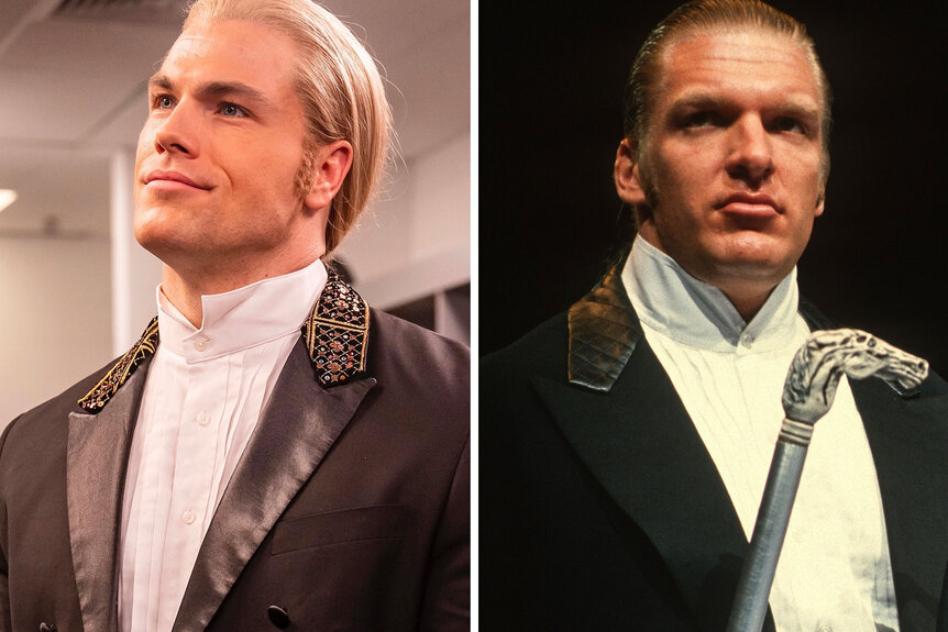 Speaking of feuds, the episode depicted the moment The Rock met one of his other in-ring rivals, Hunter Hearst Helmsley (aka Paul Levesque). Today Triple H is known as the king of the WWE and an executive vice president of the whole business. Back then, however, he had adopted the persona of an upstanding gentleman, taking to the ring in a tailcoat suit jacket and instructing his fellow Superstars on proper etiquette.
